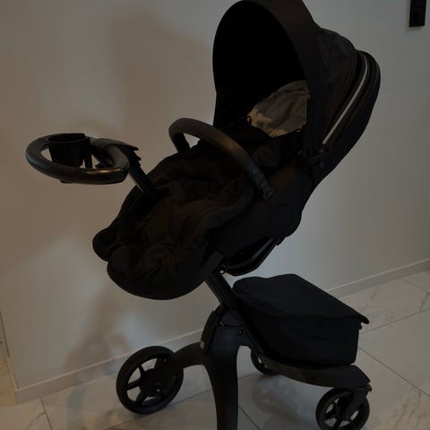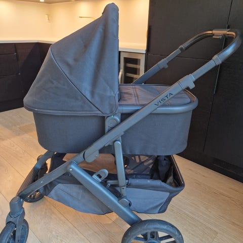 UPPAbaby Vista V2 barnevogn i svart farge. Inkluderer bærebag, sportsvognsete og bilstol. Passer for barn fra nyfødt til større barn. Justerbart håndtak og stor handlekurv under setet. Regntrekk til alle delene følger med (bærebag, sportsvogn og bilstol).