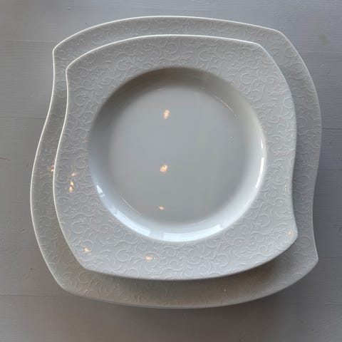 Én av asjettene har er lite merke ytterst på kanten, se bilde. Ellers er alt helt og rent :)
