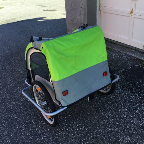 Sykkelvogn fra yngri, barnas hus. Barnevognen har en praktisk bagasjeveske bak og justerbart håndtak. Egnet for bruk med små barn. Lite brukt av ett barn