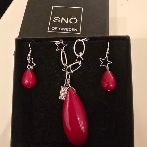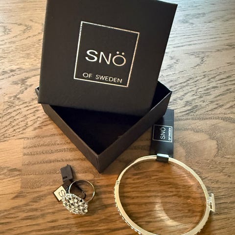 Snö of Sweden unisex smykke laget i sølv og sølvbelagt materiale. Inkluderer kjede med anheng, armbånd, ring og ørepynt med svart og sølvfarget design.