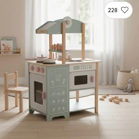 Lekekjøkken i tre som inkluderer vask, kokeplater, ovn og tilbehør.