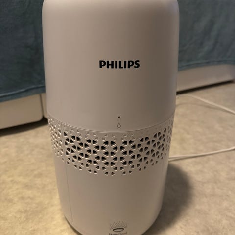 Philips HU4811 luftfukter i hvit farge. En elektrisk luftfukter med justerbar innstilling for luftfuktighet.