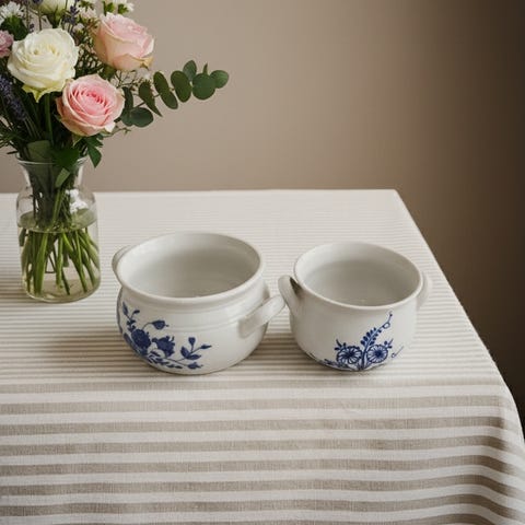 To pene, gamle, hvite Rörstrand-krukker med blå blomster