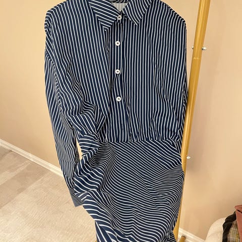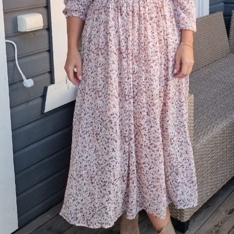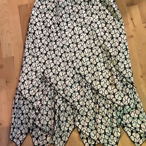 Kello sidt skjørt designet i Danmark. Laget av 80% polynosic som, i likhet med rayon (viskose), er laget av trefiber. Er i likhet med modal et mykt og silkeaktig stoff med gode egenskaper. Krymper ikke. Skjørtet er åpent foran, kneppes med 7 knapper. Linning med hemper for belte. Det følger et belte i imitert slangeskinn med. Lommer foran. Splitt bak. Foret. Det står str. 40 i skjørtet, men det er lite størrelsen, passer nok bedre til 38.