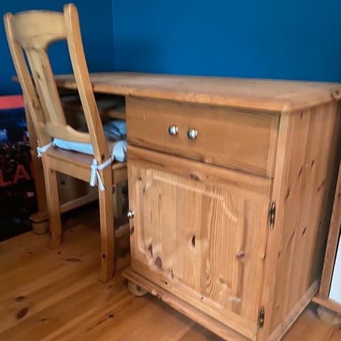 I fin bruktstand, men merker etter å ha vært brukt av tre barn. Inni skuffene er det litt blyantstreker og bruksmerker.