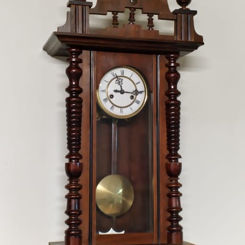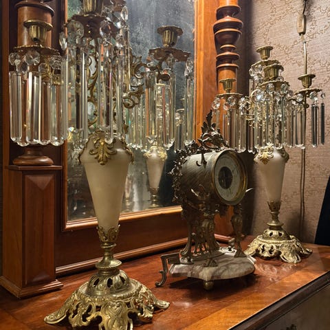 Antikk kandelaber med fem armer for stearinlys, dekorert med lysekronedetaljer og hengende glassprisme. Bud mottas.