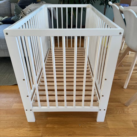 Gulliver sprinkelseng fra IKEA kjøpt i 2019. Kan monteres i to høyder, samt ta av ene siden for større barn (2-3 år). Noen bruksmerker på den ene siden, men ingenting å si for bruk, Følger med god madrass med tisselaken, sengekant, samt 2 laken tilpasset sengen. Kan også få med sengesett. Nydelig sengehimmel følger også med!