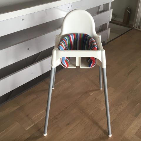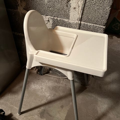 2 stk IKEA høy juniorstol/barnestol i hvit plast. Stolen har en enkel og funksjonell design som passer til barn. Egnet for bruk ved spisebord eller andre aktiviteter som krever en høy sitteplass.