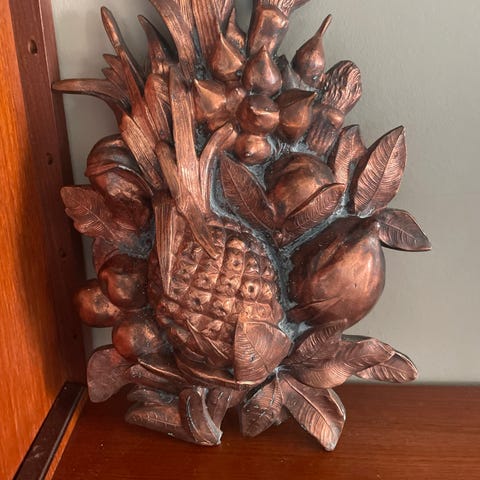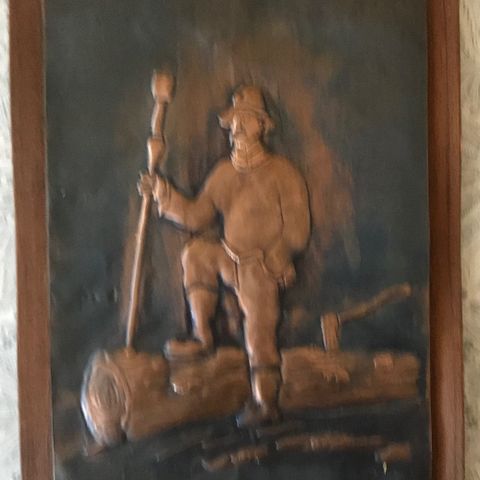 dekorativt veggrelieff i hamret kobber med stilisert fuglemotiv.