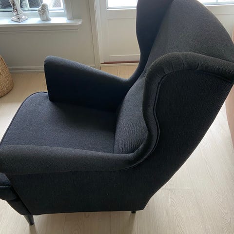 Strandmon lenestol fra IKEA selges. Noe nuppete i stoffet og merke øverst på stolen, dette er ikke forsøkt fjernet. Selges rimelig og som den er.