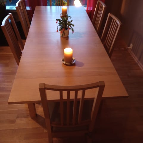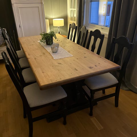 Solid og godt spisebord i bjørk. Et godt og stødig familiebord, med praktisk ileggsplate. Plass til minst 8-12 personer.