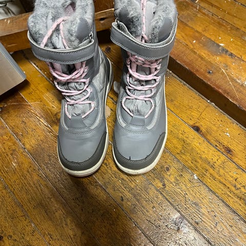 Sorel barn vintersko i størrelse 36, designet for jenter. Skoene har en lilla og blå fargekombinasjon og er laget med materialer som egner seg for kalde værforhold. De har en solid såle for godt grep. Pent brukte, må hentes.