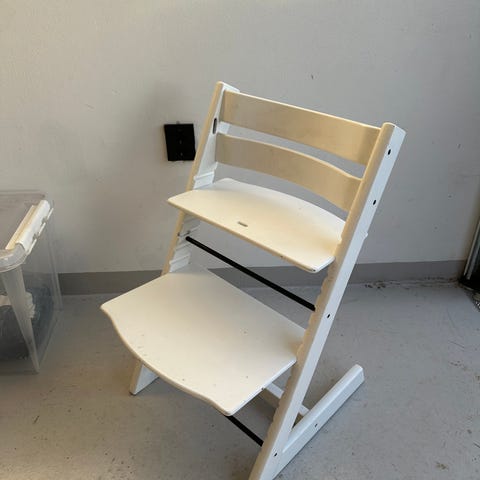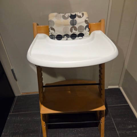 Tripp Trapp-stolen fra 2006 selges. Jeg hadde planer om å farge stolen, men har ikke motivasjon til det nå 🙂. Den kan brukes som den er, eller males i ønsket farge. Alt babyutstyr til Tripp Trapp-stolen passer til denne modellen.