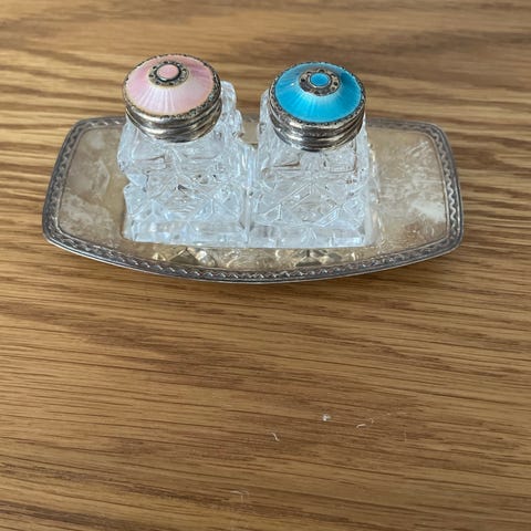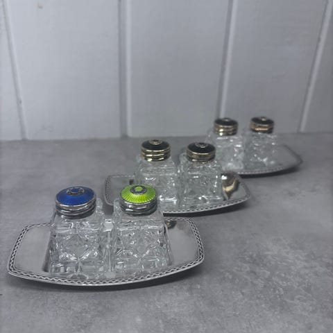 Salt og pepperbøsser med emaljetopp fra David Andersen selges kr 350 pr stk.