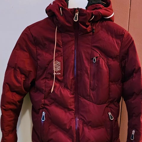 Jakken har en polstret design med hette og snøring i midjen for justerbar passform. Veldig varmt