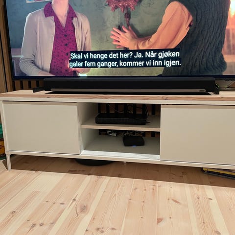Tv bord fra Jysk, veldig fin. Er brukt i ca 1år. Er bruksmerker, litt søl på den men kan vaskes vekk. Den langside skuffen er litt slitsomt å lukke igjen ettersom det har vært tunge ting som har belastet den platen som ligger nedi at den bøyer seg nedover som gjør det litt slitsomt å få lukket den igjen. Må som regel løfte og presse under ifra for å få den lukket igjen, ellers veldig fin tv benk utseendemessig. Selges pga flytting.