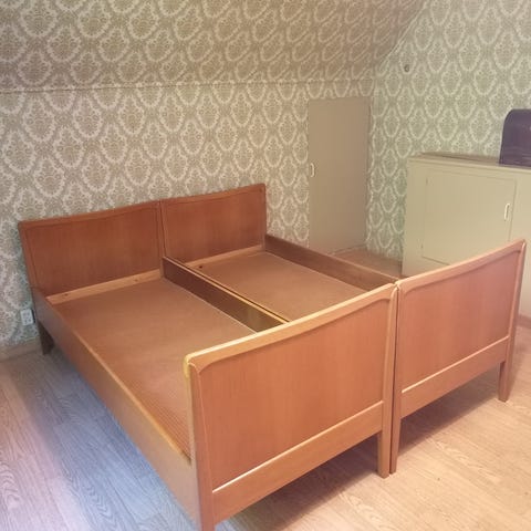 2 stk senger på 90 cm bredde. Madrassene har fjører.