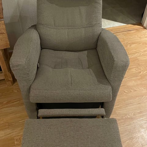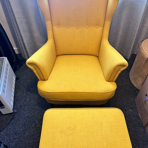 Lenestol med høy rygg, grått stofftrekk og knappedetaljer på ryggstøtten. Har polstrede armlener og sittepute. Fire svarte ben i tre. Passer til oppholdsrom og stuer. Fotskammel følger med