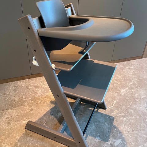 Stokke Tripp Trapp høy barnestol laget av tre i naturfarge. Justerbar sitte- og fotplate for tilpasning til barnets vekst. Stolen har noen synlige bruksmerker og slitasje på treverket, inkludert riper og flekker (se bilder). Men ellers i strålende stand. Kjøpt ny i 2021