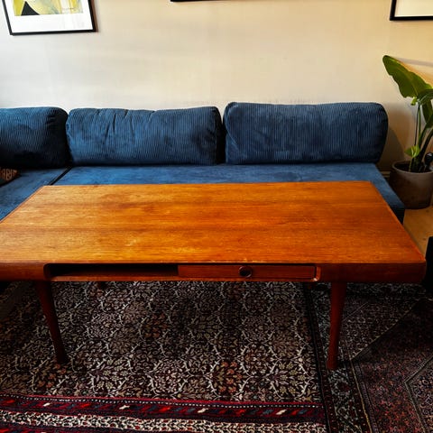 Selger et solid og pent sofabord i tre med finért plate og kraftig understell. Bordet har et tidløst, nordisk uttrykk og fremstår som godt håndverk fra en periode der møbler ble laget for å vare.