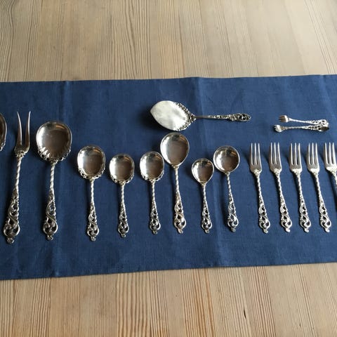 Har også koldtgafler, paispader, sukkerskjeer, stor anretningsskje 21,5, syltetøyskjeer 12,5 og 14,5, smørgafler, liten serveringsspade, kakegafler 13,8, ostehøvel 22,5, potetskje 21,5,
