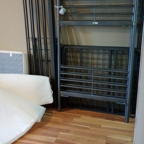Godt brukt og ferdig pyntet køyeseng gis bort. Sengen er stabil og kommer med to madrasser (70cm). Kan også brukes som to separate senger.