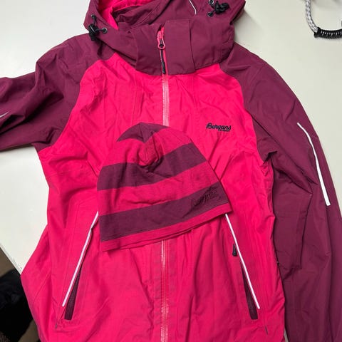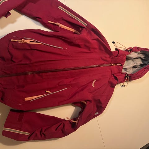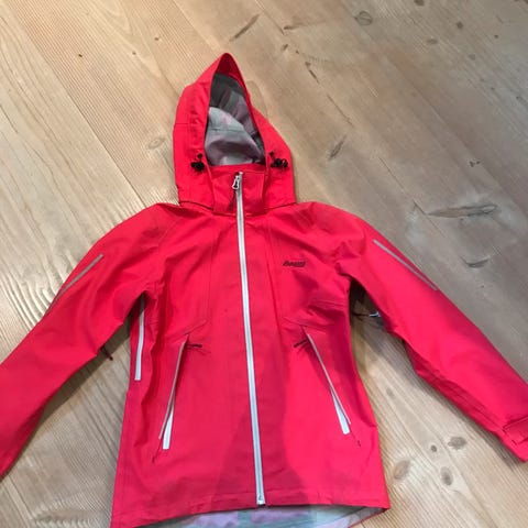 Bergans barnejakke i størrelse 152 for jenter. Jakken er rødoransje og laget av polyamid materiale. Den har hette og glidelåslommer, egnet for utendørs bruk. Refleks på lommer, skuldre, hette og nederst på rygg.