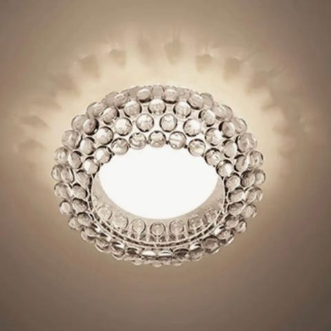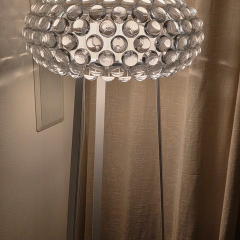 Denne er utstyrt med mange små perler som bryter det varme lyset og skaper en glitrende effekt i omgivelsene. Den diskrete rammen gjør den ekstravagante skjermen til gulvlampens høydepunkt. Takket være det diskré fargedesignet kan Caboche Plus enkelt integreres i en rekke offentlige og private rom. Armaturserien Caboche er designet av Patricia Urquiola og Eliana Gerotto. Patricia Urquiola er en anerkjent arkitekt og designer hvis arbeider er utstilt i museer og samlinger over hele verden. Eliana Gerotto arbeider blant annet som grafisk designer, smykkedesigner og produktkonsulent.