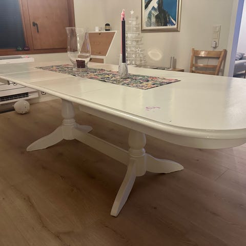 Hvitt spisebord med ileggsplate gis bort. Det er synlig brukt, men i grei stand. 150 cm langt og 200 cm med ileggsplate.