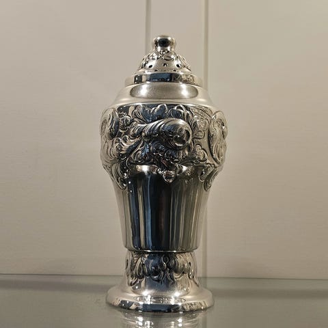 Sølv sukkerskje med vridd skaft og bladformet skjeblad. "Norge" og dekor i blå og hvit emalje. Produsert av David Andersen.