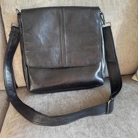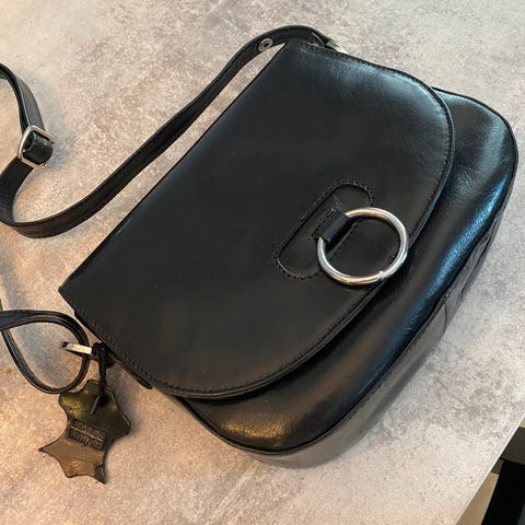 Lomme til mobil og glidelåsrom inni og utenpå. Lekker veske som rommer litt.