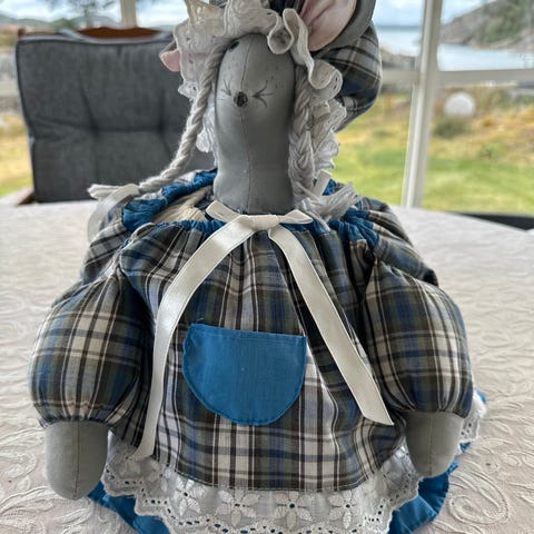 vintage pynt, dekorativ, tekstil mus, stoffmus, mus figur, vintage pynt, retro pynt, shabby chic dekor, nostalgisk pynt, samlerfigur, håndlaget pynt, figur i tekstil, grå mus, mus med kjole, blomstrete kjole, blå blomster, mus med briller, søt dekor, interiør pynt, cottagecore, landlig stil, gaveidé, vintage interiør, unik pynt