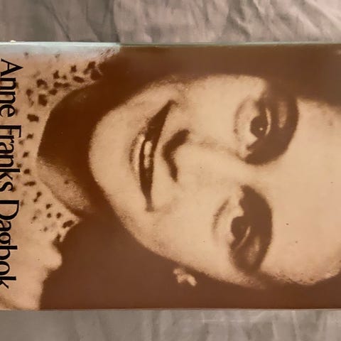 Anne Franks Dagbok med bilder og håndskrevne sider. Inneholder personlige notater og dagbokoppføringer fra Anne Frank.