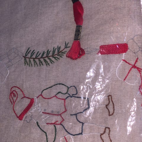 Juleduk i retrostil med brodert med korssting på stramei. Lengde 230 cm bredde 115 cm. Se bilder for tilstand. Mulig å skimte noen flekker (se bilder). Men disse er ikke synlig i kveldslys på dekket bord.