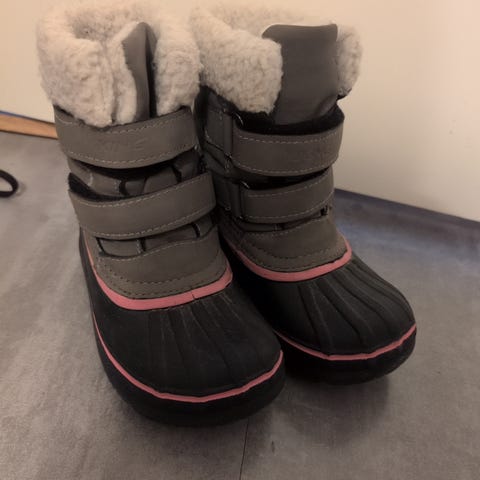 Viking barnestøvler i størrelse 25 for jente. Støvlene har en kombinasjon av svart og grått materiale med rosa detaljer. De har to borrelåsstropper for justerbar passform og en varm, fôret overdel. Sålen har et mønster som gir godt grep.
