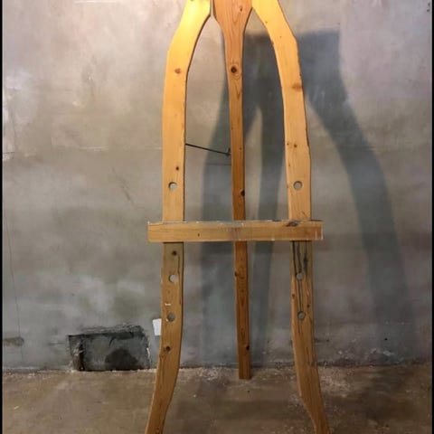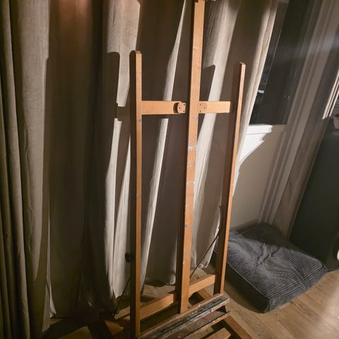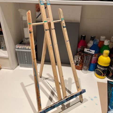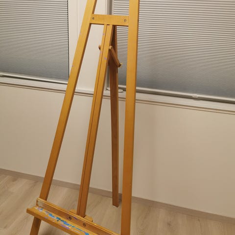 Staffeli laget i tre materiale. Justerbar høyde for å holde lerret i ulike størrelser. Egnet for bruk i atelier eller hjemme for maleri og tegning.