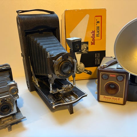 Kodak Six-20 Brownie D er et halvformat kamera med et klassisk design. Kameraet har en svart finish med hvite detaljer rundt linse og søkere. Det er et boks-kamera som bruker 620 filmformat. Annet, ukjent modell medfølger. Dekorative, neppe brukbare. Kjøp på bilder.