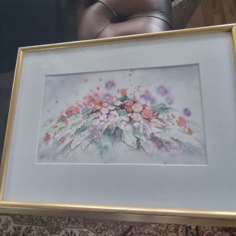 Trykket er innrammet med passepartout og gullfarget ramme.