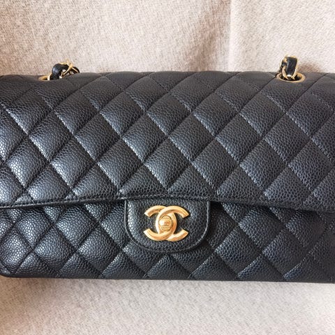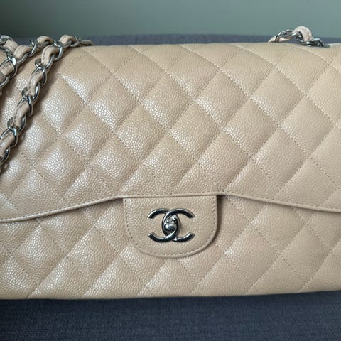 Selger en nydelig chanel jumbo single flap i burgunder/vinrød med sølv hardware. Elsker du jumbo men syns den er tung? Da er single flap vesken for deg! Langt lettere og mer romslig enn double flap.
