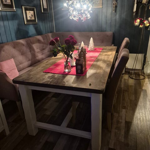 Vanlig bruksslitasje. 6 stoler og ileggsplate.