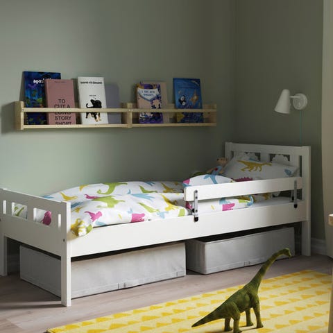 IKEA SLÄKT enkeltseng for barn med integrerte skuffer og åpen oppbevaringshylle. Sengen er pent brukt og uten synlige bruksmerker. Malfors madrass kan følge med om ønskelig for kr 300 ekstra.