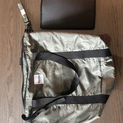 Grå stelleveske med tilbehør bestående av isolert flaskeholder og skifteunderlag. Vesken har flere rom og lommer, samt justerbar skulderrem. Innvendig fôr i lys grønn farge med elastiske lommer for organisering.