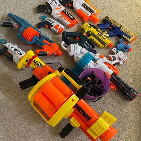 Nerf Rival Kronos XVIII-500 lekepistol i oransje farge. Pistolen har et roterende trommelmagasin som rommer 24 skudd. Laget av plastmateriale og designet for barn. Egnet for innendørs lek. Selges med 24 skudd. Har noen 10pk med ekstra skudd, kr 15 pr pk.
