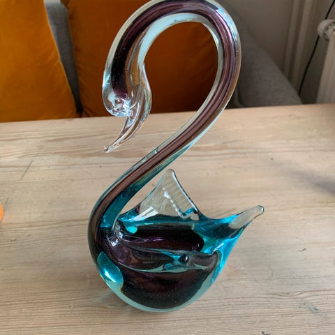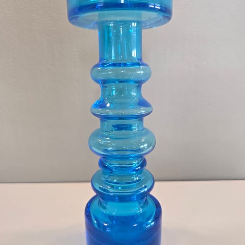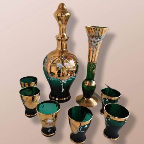 Selger 2stk håndblåste små vaser i to forskjelige farger: større /21,5cm /, mindre /12,5cm/ fra MURANO- VENEZIA, ITALIA fra 70-tallet. De er belagt med 24k gull.