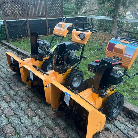 Selger en Toro snøfreser og en stiga snøfreser begge er 8hk den røde Toro en starte og alt funke men trenger en forgasser rens mens den gule Stiga en skal starte og gå fint men trenger nye reimer og ny girkasse til skovlene foran selges samlet får 3000 kr