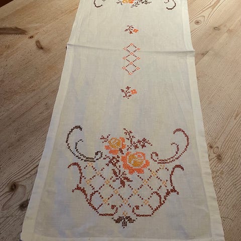 Bordløper i rødt og hvitt med mønster av reinsdyr og graner. Stoffmateriale med vevd struktur.