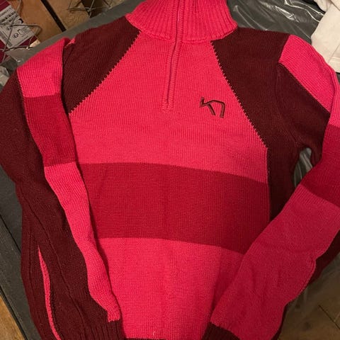 Kari Traa ull genser i størrelse S. Genseren er rosa med mønster og laget av ullmateriale. Full lengde 64 cm. Brystvidde 34 cm (ca. 68 cm omkrets) når utøyd. Liten i størrelse. Ikke så elastisk. Passer til et barn.