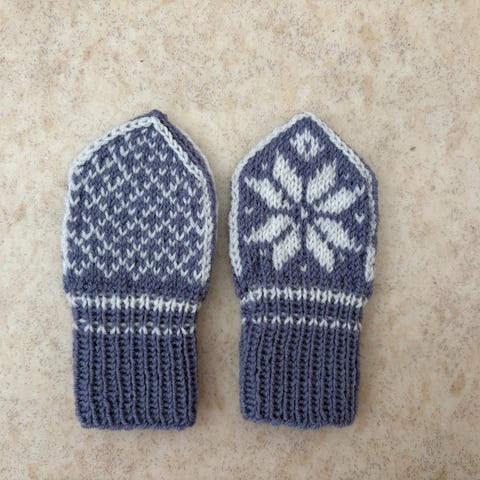 Selbuvotter til småbarn, strikket i sunday (100% merinoull) fra Sandnes garn. Vottene har ikke tomler og passer til ca 1-2 år. Vottene er ubrukte.