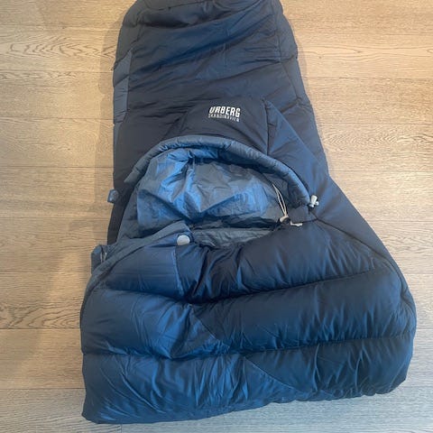 Haglöfs sovepose i blå farge med røde detaljer Utstyrt med glidelås og borrelåsfeste.