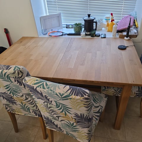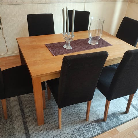 Jeg selger et godt eikebord med en diameter på 100 cm, 4 stoler følger med.